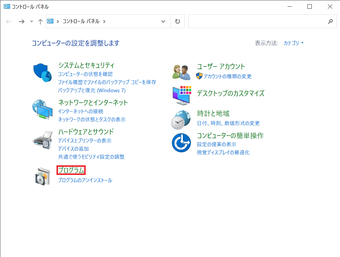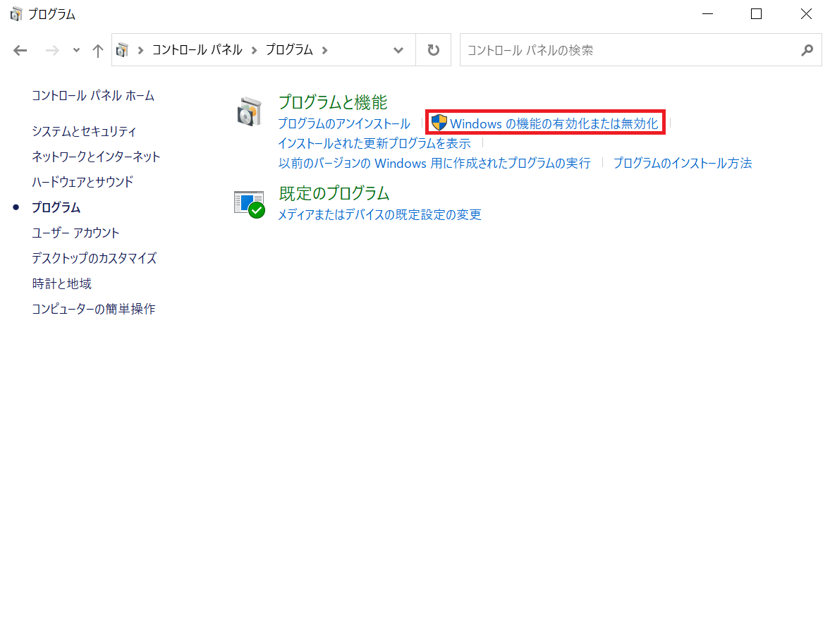 ②コントロールパネルが開かれるので、プログラム→Windowsの機能の有効化または無効化の順に進む。