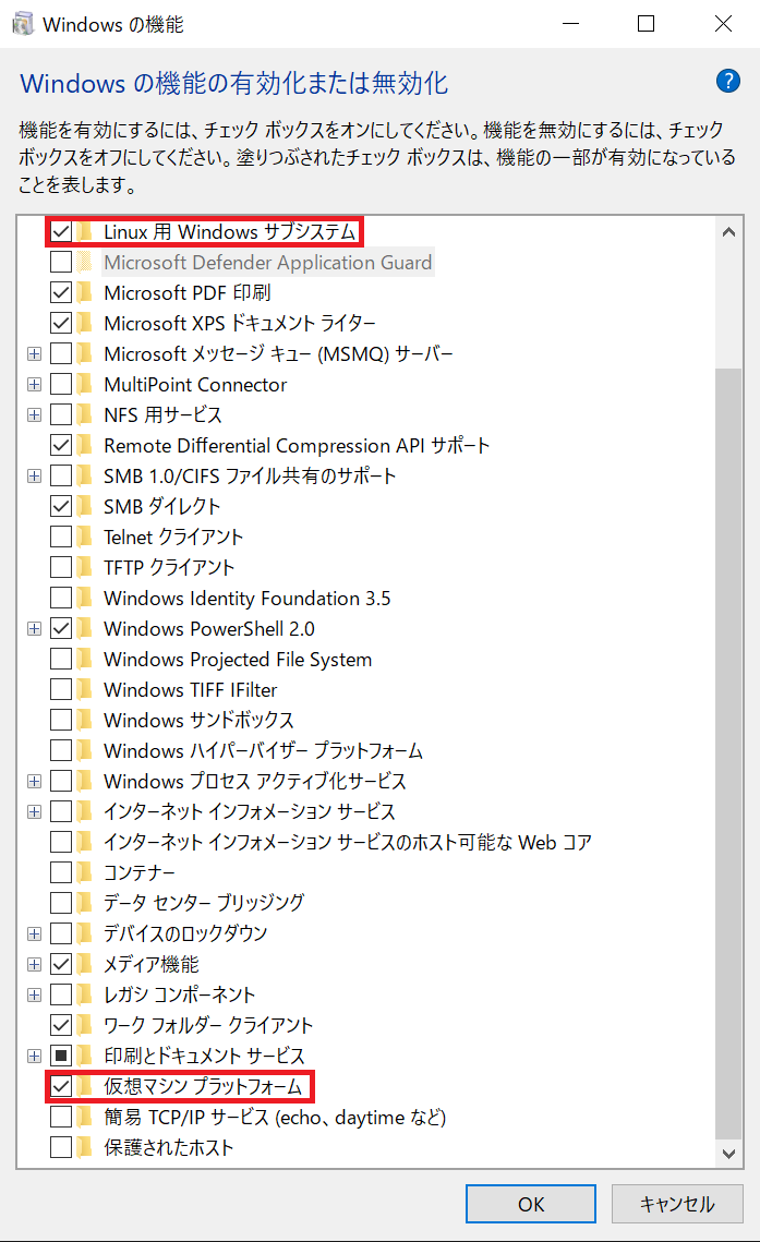 ③Linux用Windowsサブシステム・仮想マシンプラットフォームにチェックを入れる。この後再起動が促されるのでそれに従う。